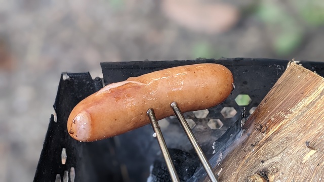 デイキャンプはゆっくりするためマッカラ。ソーセージを100均のマシュマロ串に刺して熾火で炙ります。しばらくして「ぷしゅ〜」といい音がすれば、ひっくり返す合図。さらに油が落ちる「じゅわ〜」と音がすると食べ頃。