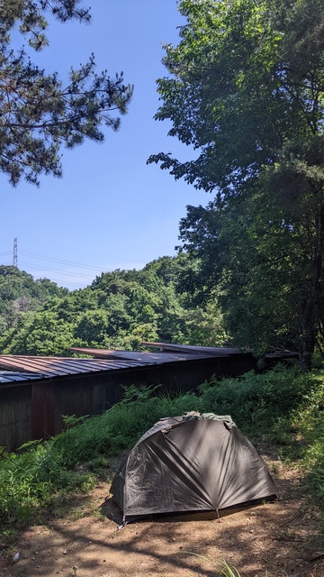 旧バンガロー裏は見晴らしが良く、いい具合に木陰もあるので気に入りました。すぐ隣にあるバンガローの建物も思ったほどは気になりませんでした。また一つ「居場所」を開拓できました 🙂